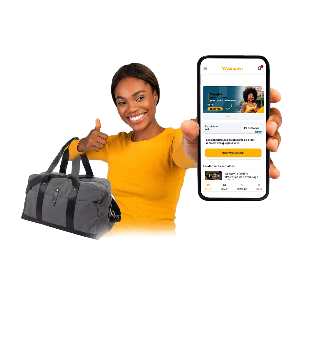 Avec l'application Wɔōnonvi, rien ne vous échappe ! Proposez ou réservez des trajets en toute simplicité. Téléchargez dès maintenant pour profiter d'une expérience de covoiturage fluide et rapide.